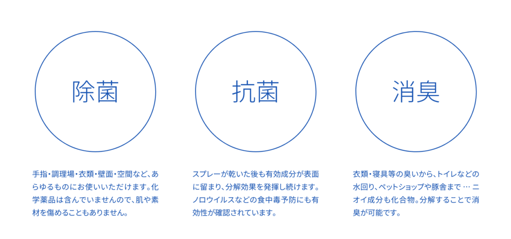 有効成分は100%天然由来(土壌から採取した微生物と酵素)であり、化学薬品を使用していないため、身体に優しく・環境に負荷を掛けません。