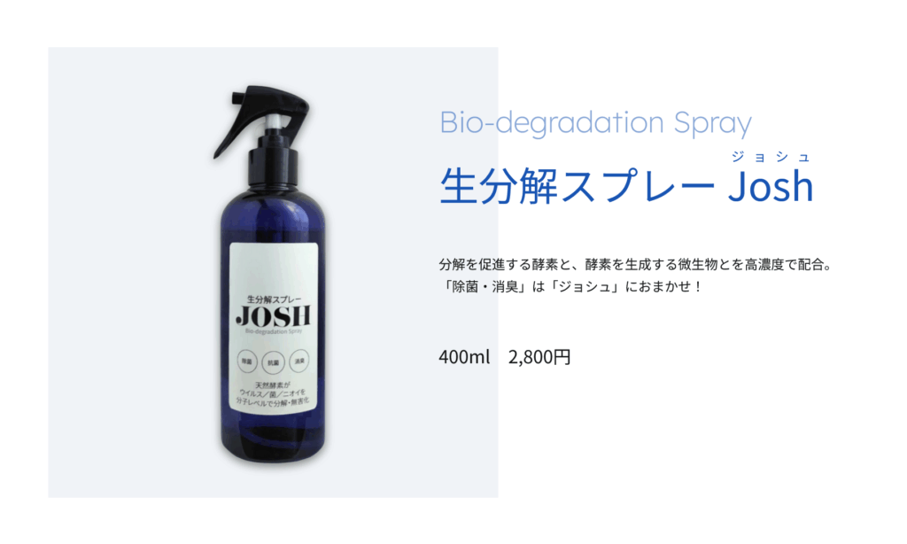 estate plus 社が手掛ける、除菌・抗菌・消臭剤: 生分解スプレー Josh (ジョシュ)。