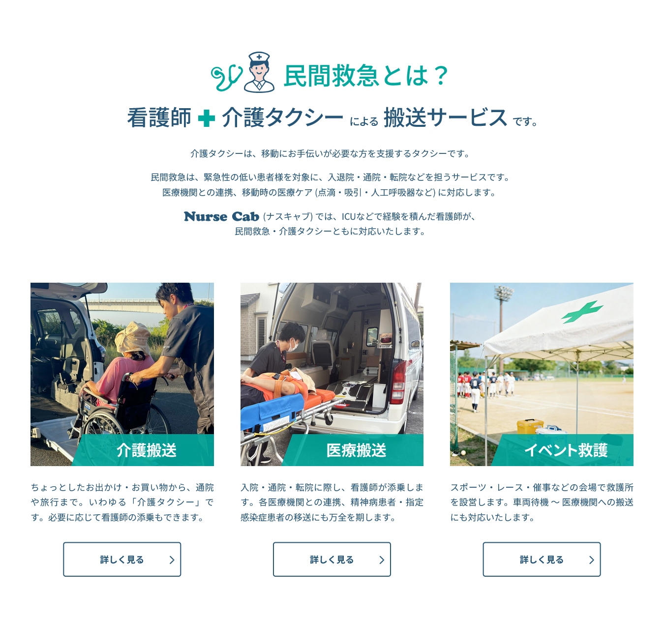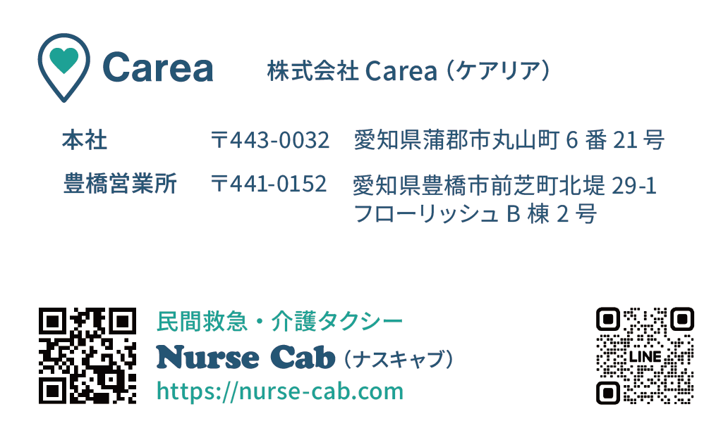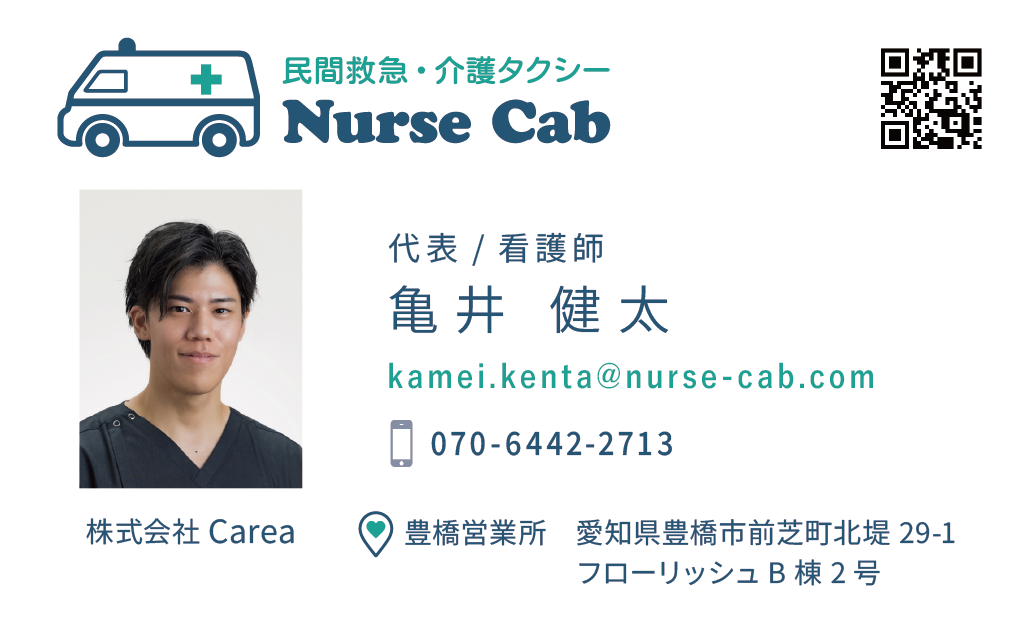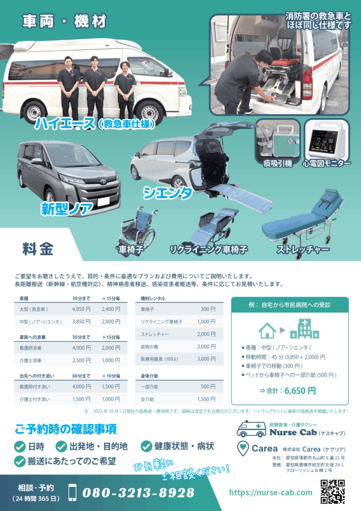 民間救急としては東三河初となる(ナスキャブ)。介護・医療ケアを要する方にも、行きたい場所に行けるように ── 看護師が同乗/添乗し、移動・搬送を行うサービスです。