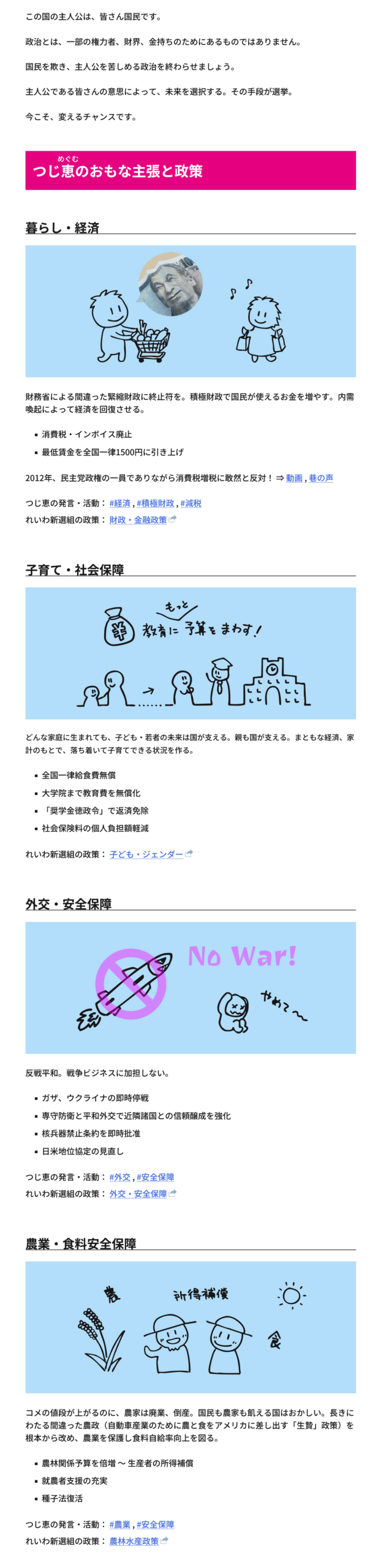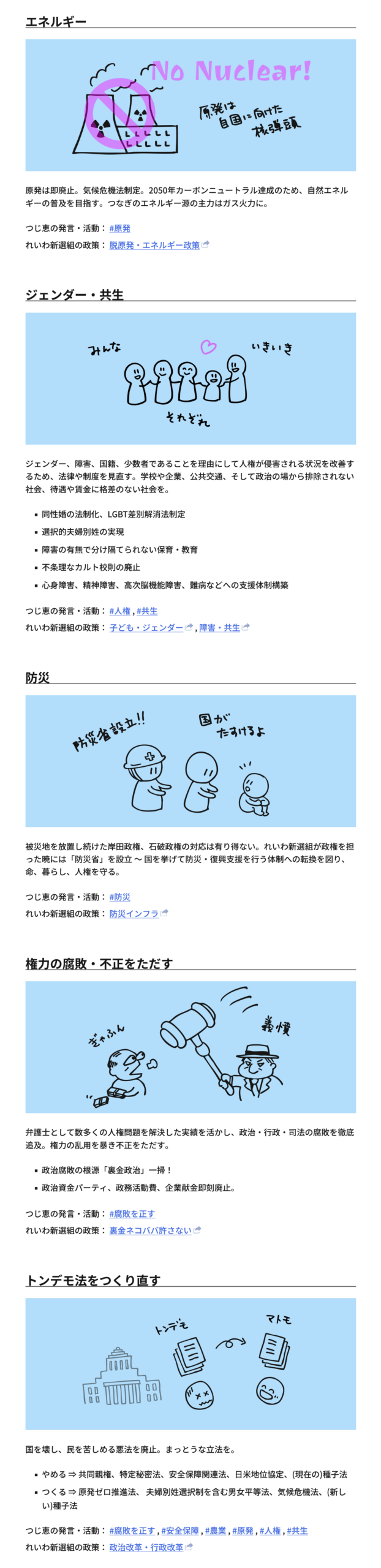 政策ページでは、イシューごとにタグ付けされた投稿(辻さんの講演会や街宣の様子など)が閲覧できるように工夫するとともに、目を留めてもらえるよう、ゆるいタッチのイラストを描かせていただきました。
