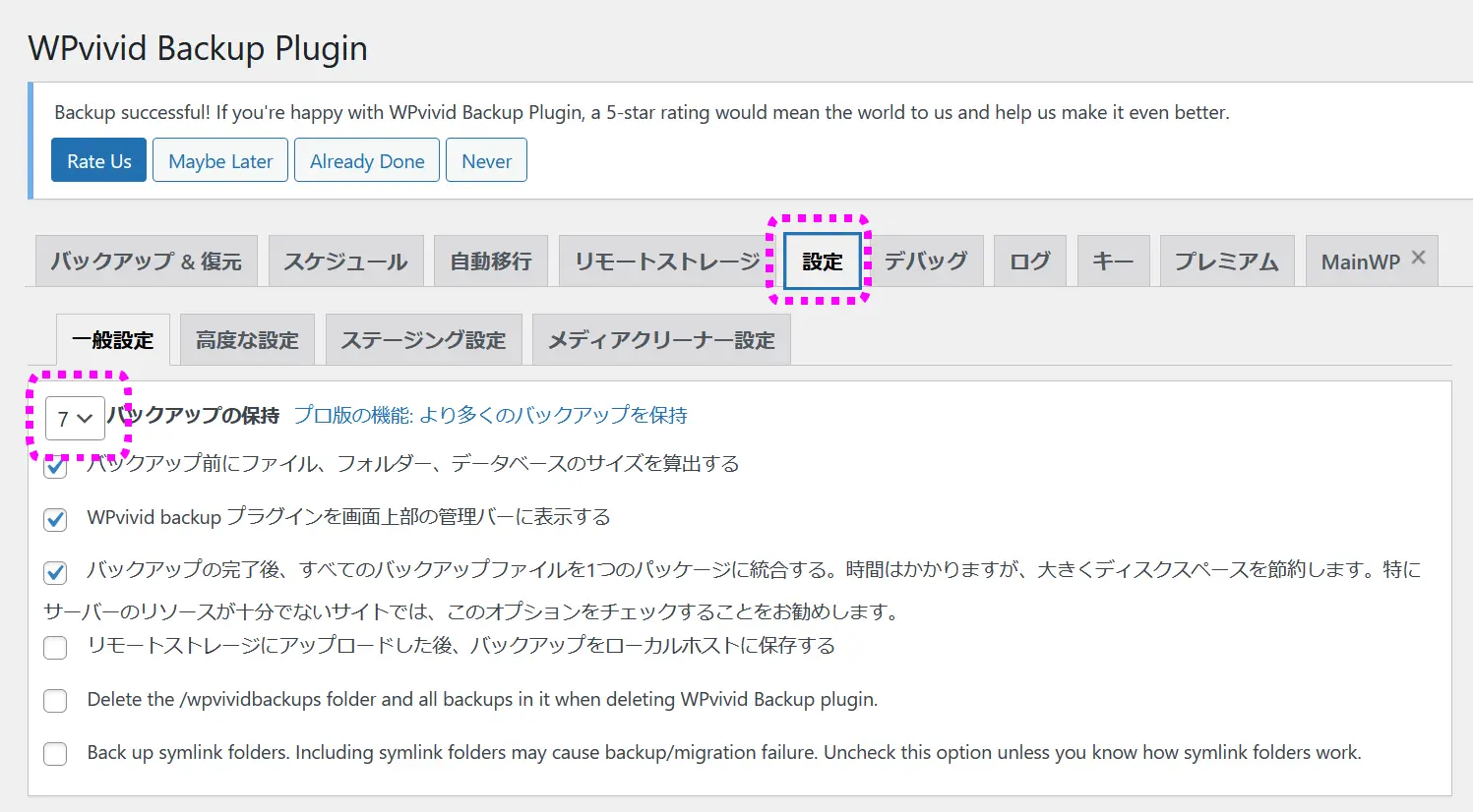 バックアップ保持数。デフォルトでは3つになっています。無料版では最大7つのバックアップまで保持できますので、その最大値としておくのが良いのではと思います。