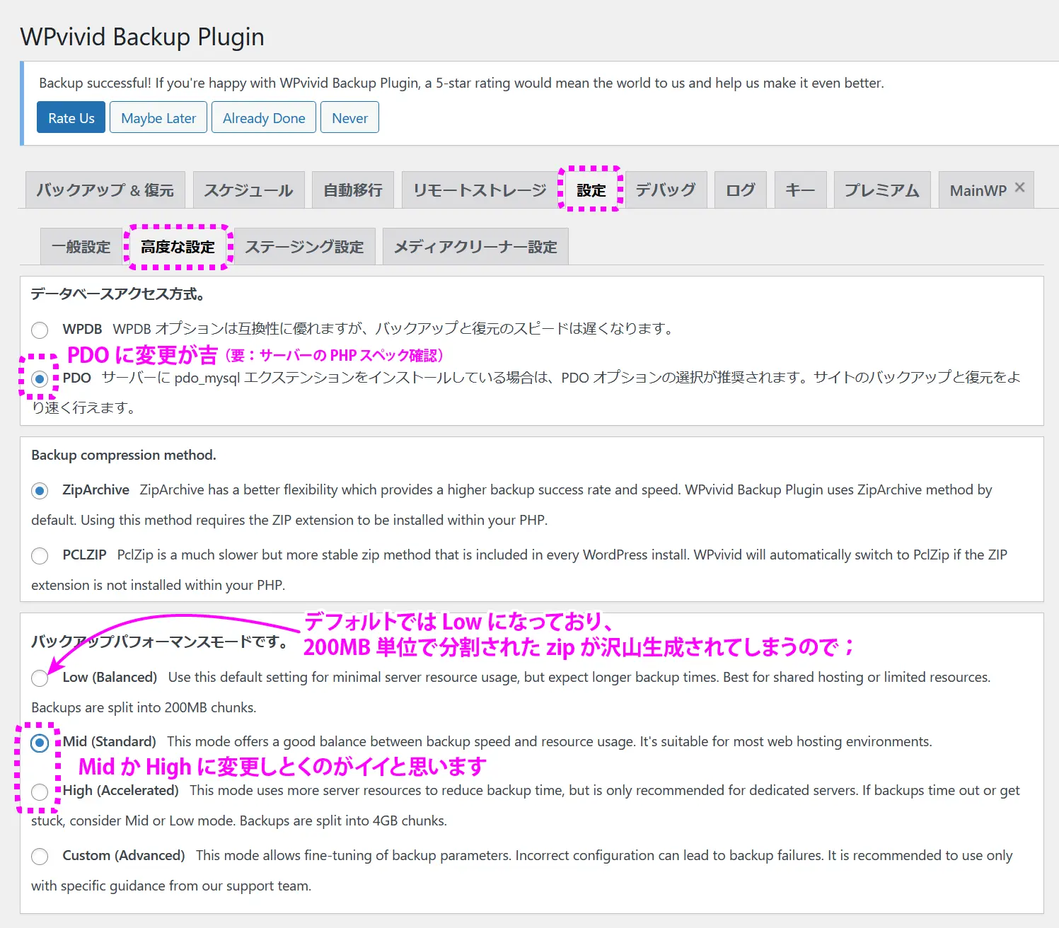 バックアップパフォーマンスモード ⇒ デフォルトの「Low」から「Mid」または「High」に。デフォルトだと、200MB単位で分割されたzipが沢山生成されてしまい煩わしいと思いますので;