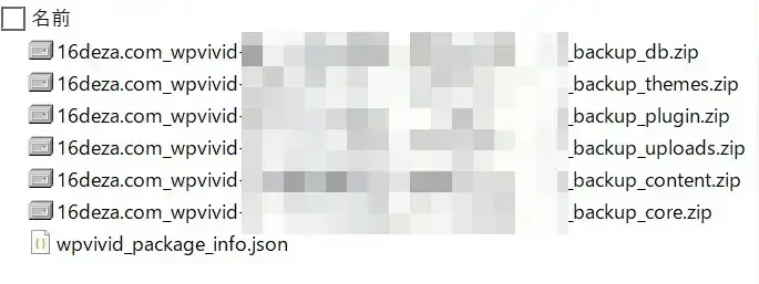 一括で書き出したzipの中身。DB、テーマ、プラグイン … のように、種別ごとのzipが並びます。なお jsonファイルにはバックアップの概要が書き込まれています。